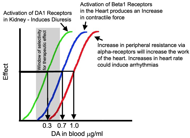 Although dopamine is usually considered a neurotransmitter of the central nervous system, dopamine is also produced and secreted by some renal cells. The pharmacology of systemically administered dopamine is complex. At low does, the drug mainly binds to D1 receptors in the kidney, resulting in renal vasodilation and a decrease in total peripheral resistance. Increased renal blood flow will result in increased urine output and decreased fluid retention and decreased edema.